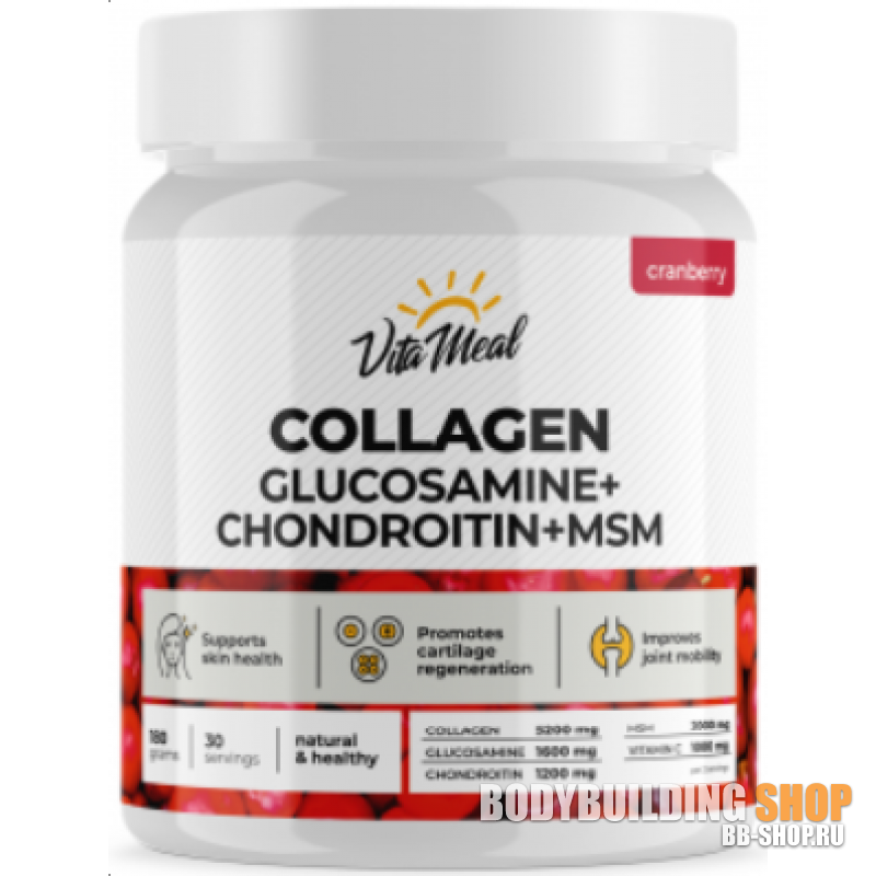 VitaMeal COLLAGEN Glucosamine+Chondroitin+MSM — это источник коллагена и хондропротекторов глюкозамина, хондроитина и метилсульфонилметана (MSM, МСМ) в порошке для приготовления напитка.